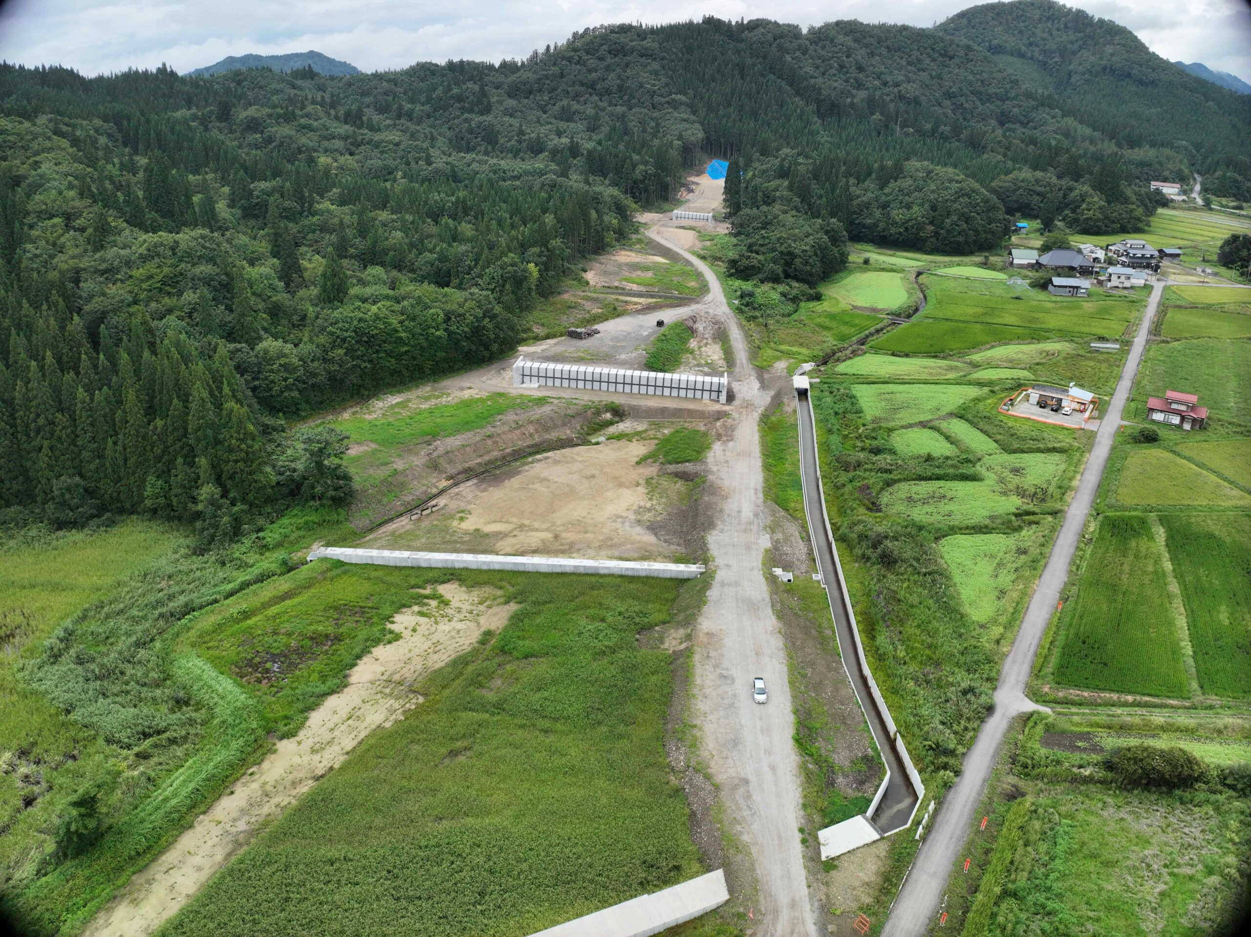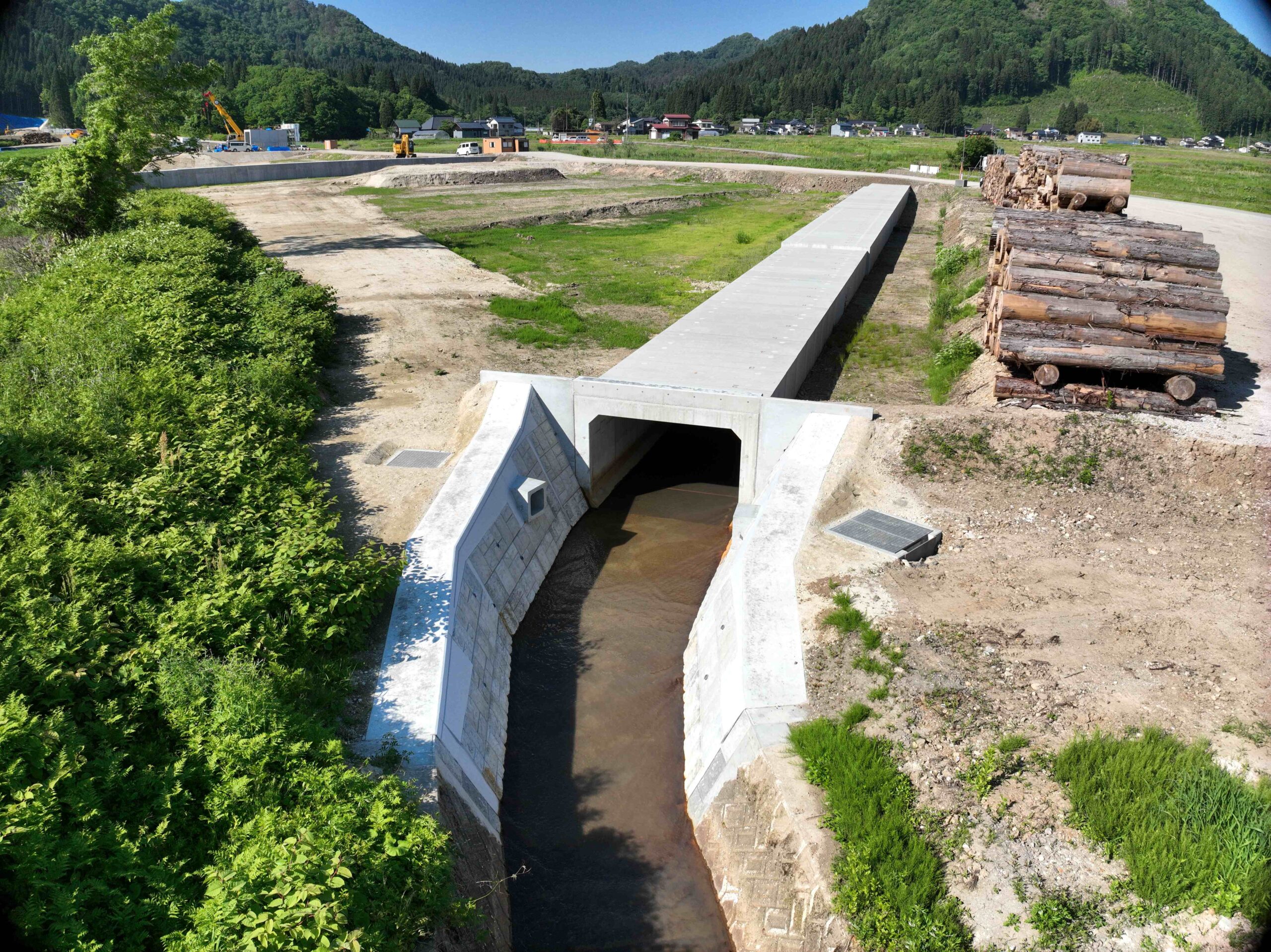 | 工 事 内 容 | 最上郡金山町大字飛森地内の一般国道13号「金山道路」整備事業の一環として、函渠3基と護岸2つを施工し事業の促進を図る工事です。本工事ではCIMの活用とICT施工、プレキャスト製品の活用に主軸として行いました。 |