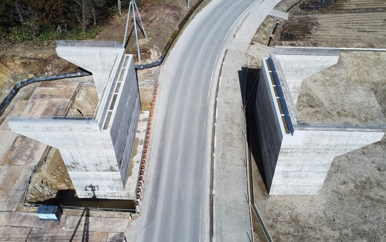 | 工 事 内 容 | 最上郡金山町大字金山地内の一般国道13号「新庄金山道路」整備事業の一環として、既存する町道の上を高規格道路が通過できるよう、橋を架ける為の土台となる橋台(下部工)を作った工事です。 |