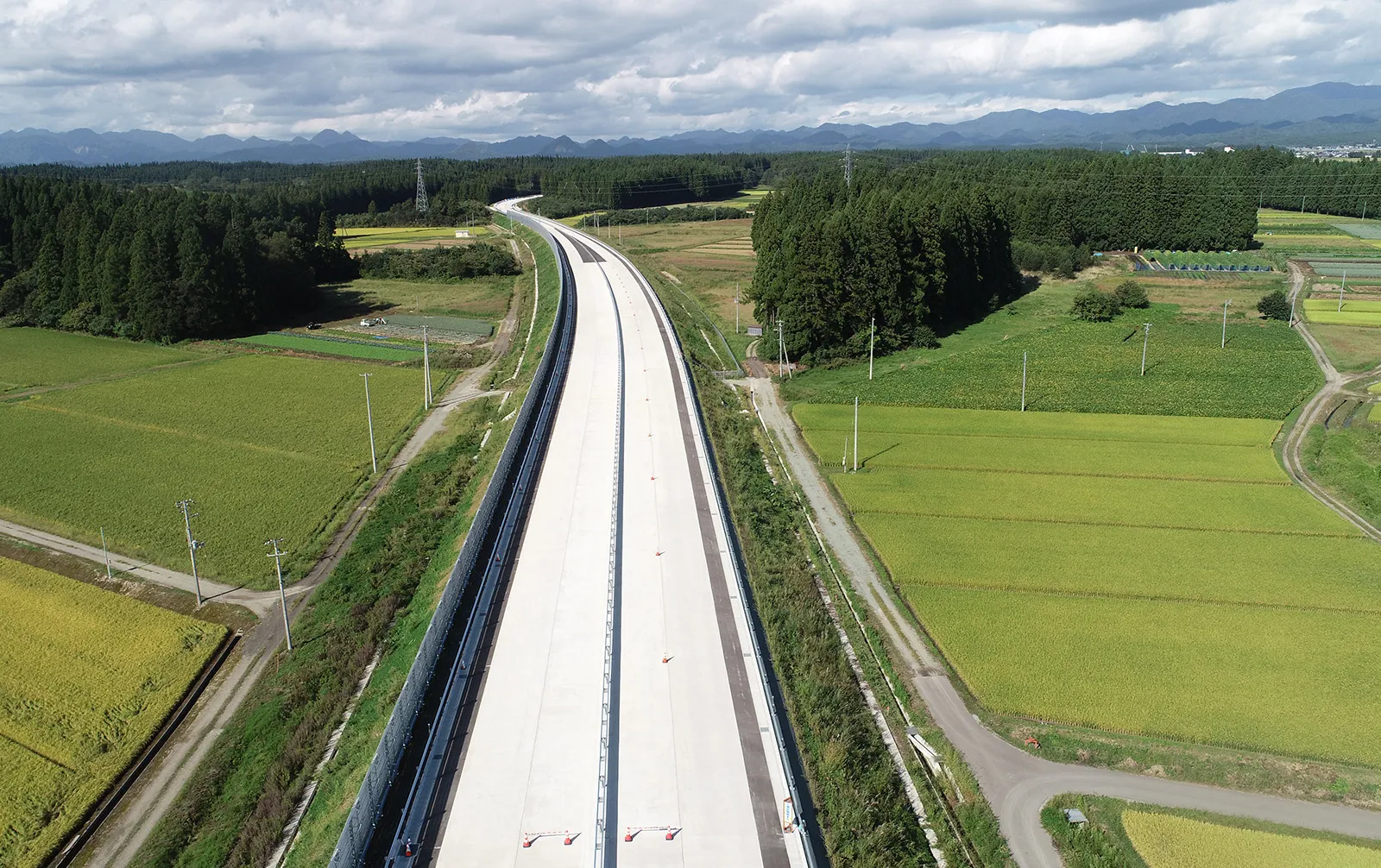 | 工 事 内 容 | 新庄市十日町地内の一般国道13号「泉田道路」整備事業の一環として、約700m区間において防雪柵・防護柵・縁石の設置を行った工事です。 |